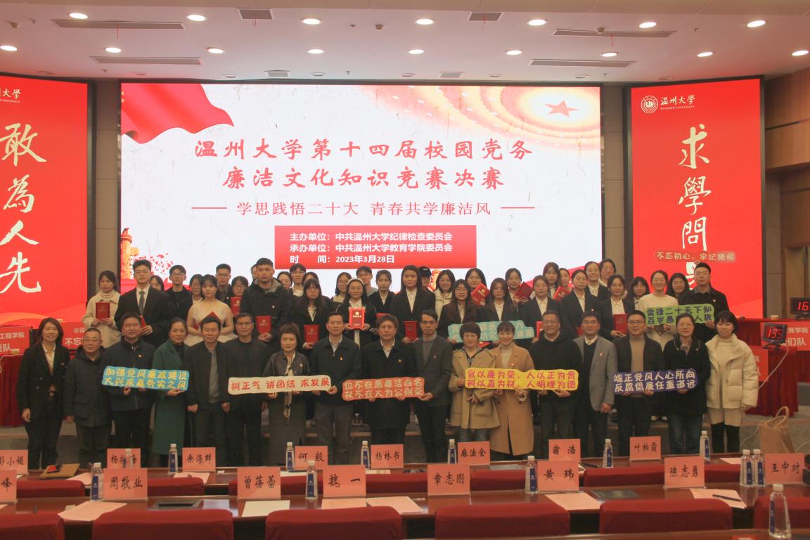 3月28日下午,以“学思践悟二十大·青春共学廉洁风”为主题的温州大学第十四届校园党务廉洁文化知识竞赛决赛在育英图书馆二楼报告厅举行。校党委委员、纪委书记、省监委驻温大监察专员杨林书,成人网站 党委书记、副院长何毅,校党委组织部副部长麻法全,校纪检监察干部和各学院党委副书记兼纪委书记、各学院师生代表共180人参加了本次活动。
