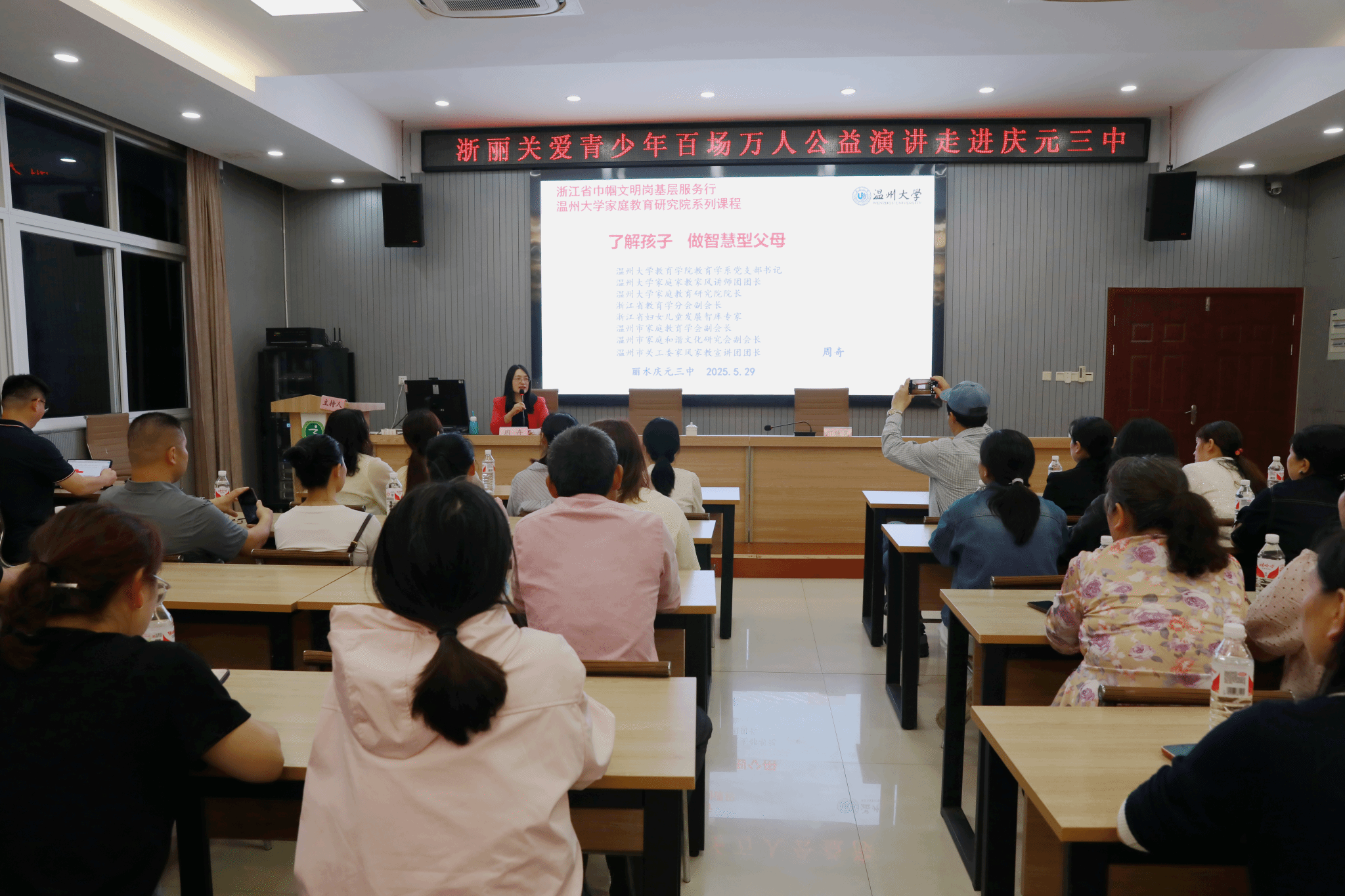5月29日晚,周奇教授受邀参加丽水市 “浙丽关爱青少年百场万人公益宣讲活动”走进庆元。庆元作为浙江省最边远的山区县,山区家长相对缺乏科学育儿知识,容易陷入“重成绩轻心理”“重物质满足轻情感陪伴”等误区,周老师结合自己主编的《家庭教育理论与实践》,为庆元三中家长们带来《了解孩子,做智慧型父母》主题讲座,用生动案例和专业知识,助力家长构建和谐亲子关系,赋能山区家庭教育。
