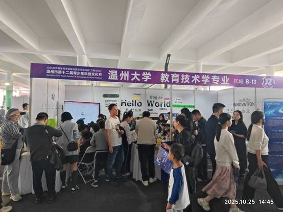 10月25日,2025世界青年科学家峰会"万有引力π"系列活动——温州市第十二届青少年创客文化节在瓯海区奥体中心盛大启幕。本届文化节以"少年π 创未来"为主题,首次打造充满未来感的科创文化街区,规划"源创π、智联π、探索π、乡梦π、实践π、奇趣π、工场π"七大特色展区,设置100余个标准展位。成人网站 教育技术系师生团队携多项教育技术前沿成果惊艳亮相"智联π"展区,通过互动体验与创新展示,生动诠释"技术赋能教育"的育人理念,斩获本届文化节"π队创新先锋"奖。