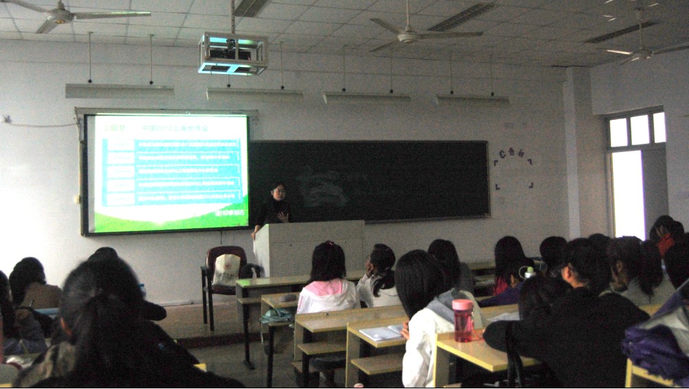 嵇老师首先给同学们介绍了中国与世博的历史渊源,让我们更加清楚的了解到中国与世博的情节早在清政府时期就开始,历史久远。接着,嵇老师给大家详细介绍了从南洋劝业到昆明园博会的一次次预演。这使我们懂得成功举办一次世博会的艰辛与付出,在掌声的背后是承办国家全力以赴的劳动。因而在即将到来的上海世博会的筹备工作中,我们中国人无论职位、年龄、地域,只要能为世博添砖加瓦,都积极投身其中。最后,嵇书记讲解了上海世博的基本情况,同学们懂得了本次世博会的主题“BETTER CITY BETTER LIFE”城市让生活更美好。