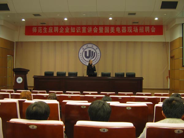 邀请,3月15日晚上温州鹏润国美电器行政总监卜莹女士在温州大学北校区信息楼报告厅开展了一场精彩的宣讲:《师范生如何敲开企业的大门?》。