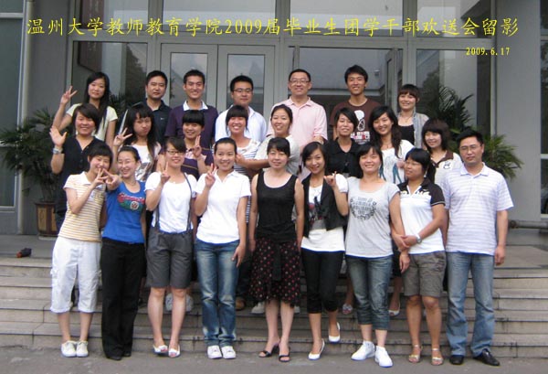 6月18日下午,温州大学教师成人网站 2009年毕业生团学干部欢送会在教育楼311会议室隆重举行,成人网站 胡伟国、嵇小怡书记与2009届毕业生团学干部亲切交流,回顾大学期间的学生干部生涯。学生干部们普遍反映,大学期间的学生干部生涯,对自身素质提高、能力提升有莫大帮助,同时对自身就业竞争力与顺利就业有重要作用,大部分学生干部已经顺利就业。