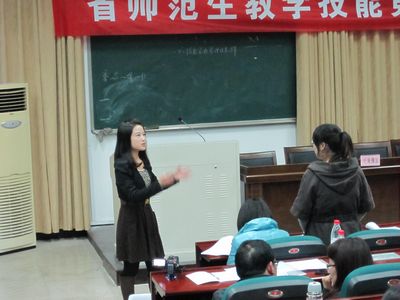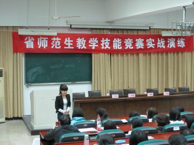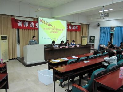 在北校区教育楼101教室举行省师范生教学技能竞赛实战演练。本次演练全程模拟浙江省高等学校师范生教学技能竞赛的程序,设有“教学设计”、“多媒体课件”、“说课•板书• 模拟上课”、“即席讲演”等4个环节。由相关专业指导教师对参赛选手进行逐一点评、指导。选手们幽雅潇洒的仪态,声情并茂的讲解,驾轻就熟的课堂调控能力,都给在座的师生留下深刻的印象。