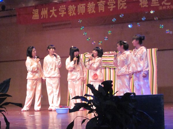 08学前中专三班的同学用热情洋溢的开场舞,瞬间点燃了全场观众的激情。在热烈的掌声中,来自18个参赛寝室的选手们一一登台,用那些熟悉的旋律,经过集体的精心改编,着实别有一番风味!10学前中专三的六个可爱的女生更是身着统一的睡衣出场,一首《GO,GO,Girl》将寝室女生的活泼可爱尽显。歌词中透漏的那些生活的岁月,那些点点滴滴的小事,都引起现场观众的共鸣。