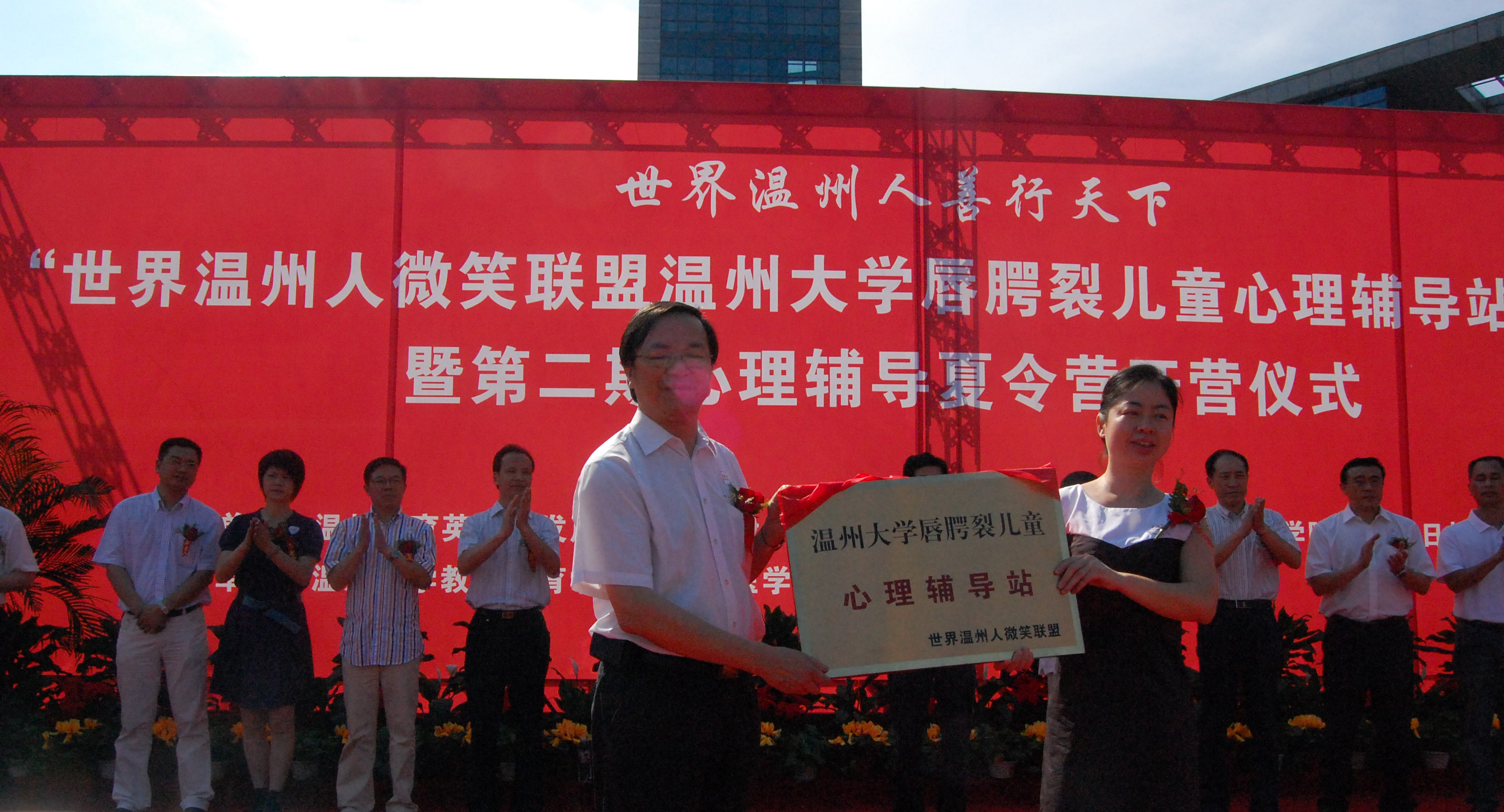 同时,红十字会及温州慈善总会为“温州微笑联盟唇腭裂儿童温州大学心理辅导站”各捐款一万元整。