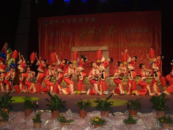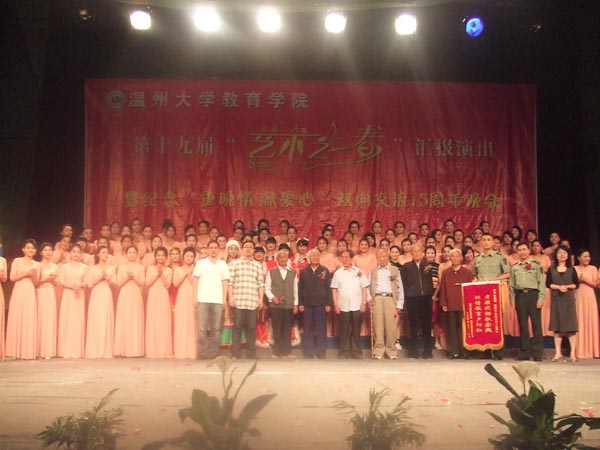5月20日晚,成人网站 第19届“艺术之春”汇报演出暨纪念“重晚情 献爱心”双向交流15周年晚会在育英大礼堂隆重举行,会场外张灯结彩、画满全场——本届艺术节的优秀美术作品展在此展出,场内热闹非凡、座无虚席——精彩的艺术节汇报演出即将开始。成人网站 党委书记胡伟国、温州大学团委副书记杨立淮、成人网站 党委副书记嵇小怡和温州市军分区干休所的23名老干部、老领导们出席汇报演出。