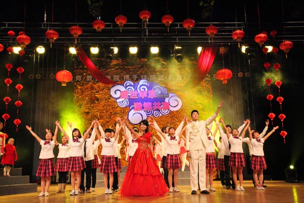 演出开始,首先给大家带来的视听盛宴是成人网站 荣获第二届浙江省大学生经典诗文诵读比赛金奖的《我有祖国,我有母语》大型朗诵节目,深情展现学子对祖国挚爱的主题、优美的朗诵和华丽的伴舞立即调动了全场气氛。而接下来的节目更是精彩纷呈:具有维吾尔族特色的群舞《旋旋旋》让人不禁陶醉于其中;歌曲连唱激情洋溢活力澎湃;充满童真乐趣的儿童剧《小熊拔牙》让人忍俊不禁;而具有时尚气息的走秀《动感新秀》也一样令人击掌。还有古筝书法表演《书风弦音》,是幽雅的古筝声中,获得规范汉字书写大赛全国一等奖的瞿秋露同学,挥笔写下的“学高为师身正为范”八个大字,让大家再次体会了一名师范生的行为准则。