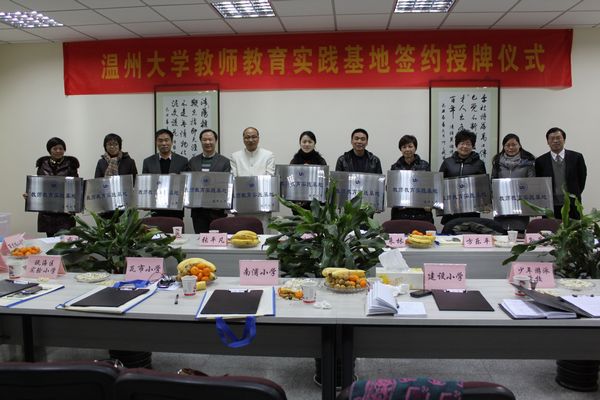 与温州市广场路小学、建设小学、蒲鞋市小学、瓦市小学、城南小学、瓯海实验小学等10所温州市知名小学举行教师教育实践基地签约仪式,副校长叶世祥、瓯海区教育局政工科副科长张平凡以及教师教育基地和教务处、教师成人网站
