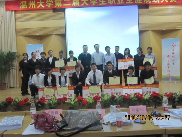 三学子获职业生涯规划大赛十佳   10月9日晚上,温州大学第二届大学生职业生涯规划总决赛在南校区会展中心雁山厅举行。   与其说这是一次比赛,不如说是一次梦想与未来的交流会,一个个期待飞翔的翅膀在雁山厅这一舞台展示各自的丰腴。在主持人介绍完规则后,各学院代表带着各自的梦想策划书以PPT的形式将蓝图绘展于每个人的面前,通过自我认知、职业认知、目标职业分析、swot分析等主要部分进行阐述,然后进行的现场答辩使规划更具清晰性,评委就不同参选者策划书所体现的优缺点做了很好的点评,并且及时给予悉心的意见与鼓励。   为了体现职业规划的全面性,比赛更安排了职业才艺展示这一部分。当晚的的舞台更因这具特色的环节裹上多彩霓裳:趣味横生的评书、轻松愉悦的旅行地、培训大讲堂都尽情淋洒缤纷色彩。其中代表教师成人网站