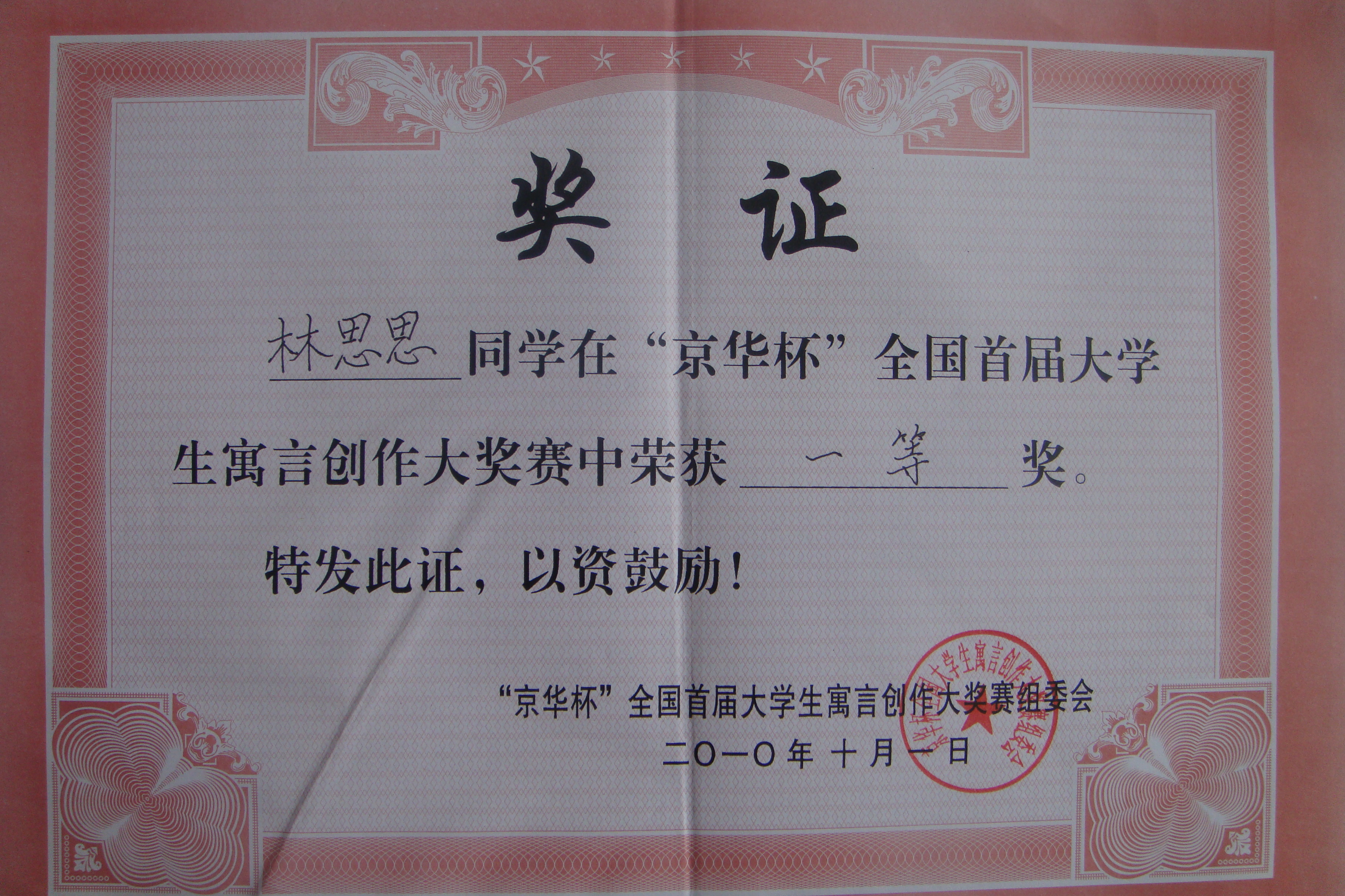 在9月30日上午刚刚闭幕的“京华杯”全国首届大学生寓言赛颁奖会上,成人网站 08小教本二的林思思同学凭寓言作品《一墙之隔》从600余篇参赛作品中脱颖而出,一举夺魁,成为此次大赛唯一的一等奖得主。