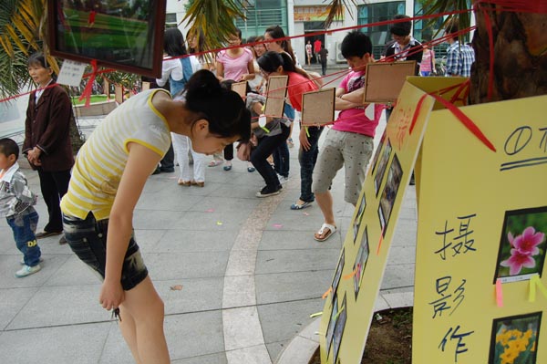 在10教技本的沈欣、毛云瑜、孙丹洁、陶冶等同学带来手语舞蹈《和你一样》之后,艺术之春数字媒体专场来正式拉开帷幕——投票环节开始。教技工作组的学生干部纷纷热情的向路过的行人介绍本次活动,并向每位路人发放一张便利贴,欢迎他们为喜欢的作品投上关键的一票。一些路人也为优秀的摄影作品所吸引,躇足欣赏。