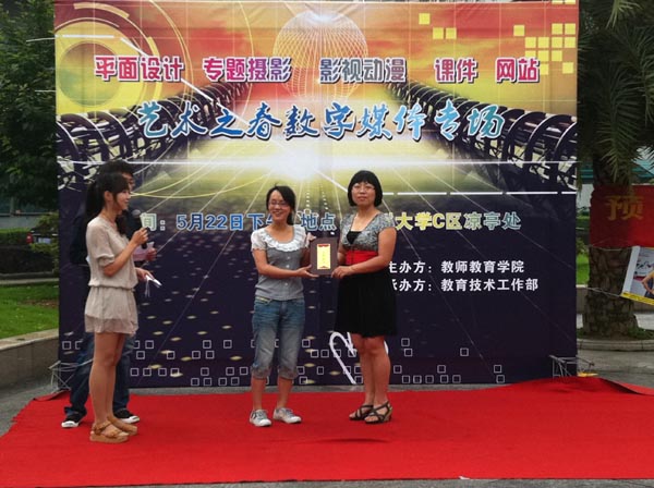在经过2个多小时激烈的投票过程之后,赖文华老师上台宣布09教技陈茜茜同学的《相望》获得最佳人气奖。至此,艺术之春数字媒体专场圆满结束。
