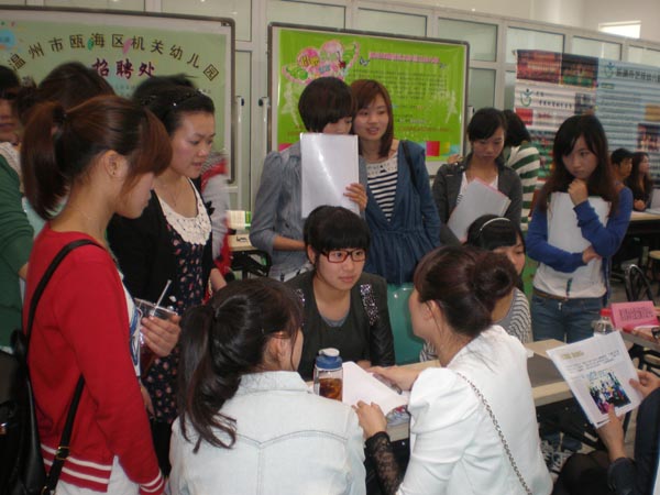 招聘会上,宏德幼儿园、温州市第六、第十幼儿园、瓯海机关幼儿园、平阳机关幼儿园等近40家单位前来招募幼教人才,共为毕业生提供200余个就业岗位,现场初步达成就业意向50余人。据统计显示,今年招聘幼教岗位数与去年相比增加近一半,现场达成初步就业协议人数减少1/3,毕业生就业选择余地增大,幼儿园招人难问题进一步凸显。