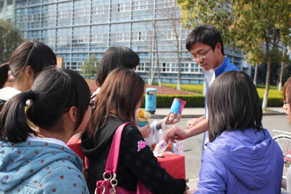 3月31日,10小教本一班再次行动起来,通过开展义卖活动为两个地震灾区奉献爱心,本次义卖物品主要是班级同学花了一个多星期精心制作的各种手工艺品。为了更好地开展义卖活动,班级成员分成四组开展义卖:一组在温大C区的凉亭义卖,一组在在教师成人网站