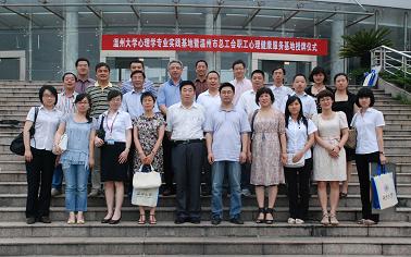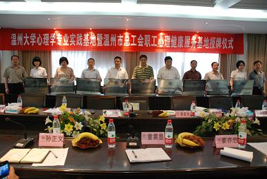吴金法书记在致词中,回顾了温大先贤办学造福乡梓的历史,并向各位贵宾介绍了温大办学之现状----新温州大学软硬件设备突出,已经取得了一系列优异的成绩。最后,吴书记指出, 在教学过程中,温州大学深切体会到,学生的专业素养和基本技能必须在实践中发展和完善; 因此,温大把实践教学看成是传统课堂教学的延伸,重视学生实践基地的建设。我校心理学专业在教育教学、人才培养、科学研究、服务地方等方面具有较为突出的优势;各家企业在温州市市总工会的领导下和我校心理学专业合作,既有利于推进我校心理学专业实践教学改革,也有利于进一步开发我校优质资源服务企业发展和职工心理健康,实现双赢。