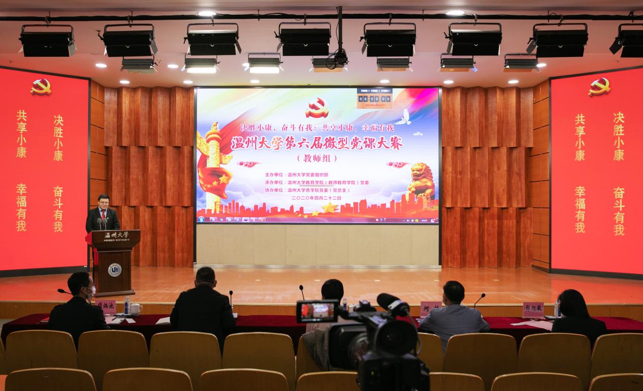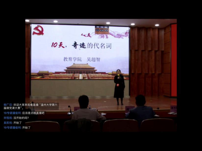 4月22日,温州大学第六届微型党课大赛决赛顺利举行,本次大赛由校党委组织部主办,成人网站 党委承办,各学院党委(党总支)高度重视、广泛动员,经过各学院初选,共有19位老师、28位学生进入决赛。教师组采用线下比赛+网络直播、学生组采用线上直播+线下点评的方式举行,参赛师生变身思政教育网红,呈现了一堂堂精彩的网络微党课,600余位同学全程观看比赛,师生精彩的微党课收获了线上观众5000余次的点赞,也获得现场专业评委们的高度赞许。