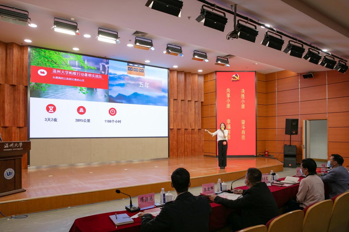 陈鸿超老师讲述了他的老中医岳父主动请缨,身先士卒带领团队奋战抗疫一线的的感人故事。潘亨妮老师以“小康是一支笔着墨在色彩里”为题,描绘了“五水共治”、“两个健康”、“最美逆行者”的优美画卷。单伟乐老师的课堂中,奋斗是心系国民、“枕戈待旦”的众志守护;奋斗是复工复产、“破茧成蝶”的自我加压;奋斗是共克时艰、“百炼成钢”的恒久守望。林大可老师以瑞安市陈岙村的乡村振兴之路为例,讲述了脏乱差农村如何摆脱贫困走向振兴的故事。王颖老师讲述了温大学子在志愿服务中致力小康、创新创业的实践中助力小康、在共同战“疫”的实践中助力小康的生动案例。