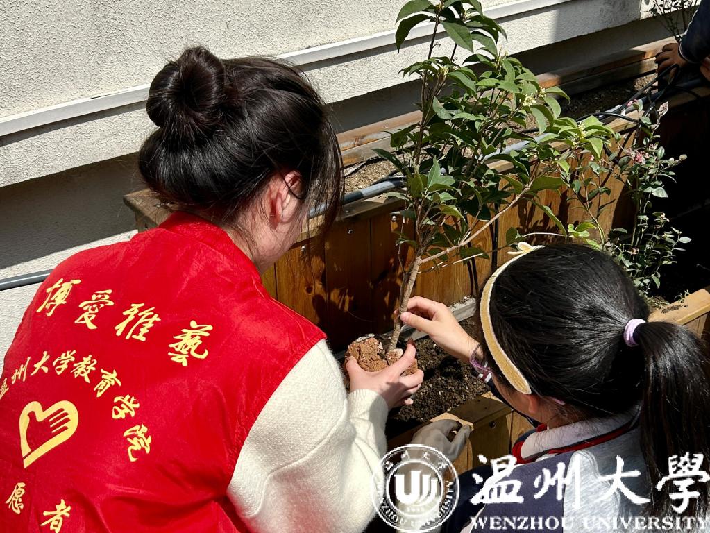 春风吐绿,草木初萌。在第45个植树节来临之际,为使小学生亲近了解自然,培养热爱自然、珍爱生命的生态意识,同时体验劳动的不易与乐趣,成人网站 的志愿者们在温州大学城附属学校开展了以“树木树人感悟生命力量,潜心浇灌奔赴美好未来”为主题的植树活动。