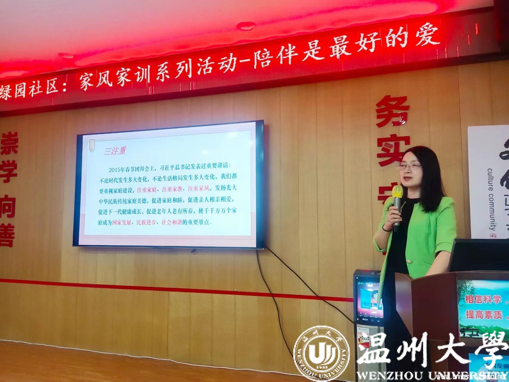 “孩子最渴望的、最好的礼物其实就是家人的陪伴。或许是爸爸与孩子嬉戏打闹,或许是与妈妈的一起做手工,或许是晚上父母坐在身边讲故事,或许是和全家人一起外出野餐……”近日,温州市家庭教育服务进社区家风家教系列活动进文化礼堂走进蒲鞋市街道绿园社区,成人网站 教育系支部书记、温州大学家庭教育研究院院长、温州大学家庭家教家风讲师团团长、浙江省妇女儿童发展智库专家、温州市家庭教育学会副会长周奇教授为家长们开展《陪伴是最好的爱》家庭教育公开指导课。