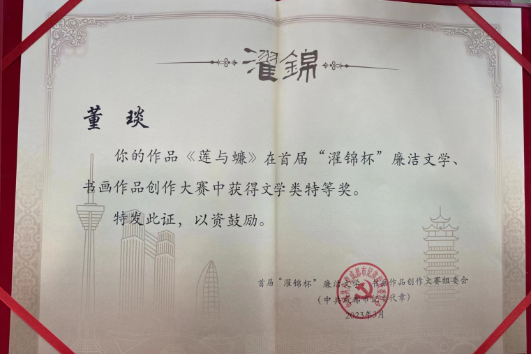 2004年12月,董琰出生于温州鹿城,目前就读于温州大学小学教育专业,是一名大一学生。2022年10月,从小就热爱阅读、写作的董琰,在大学军训期间看到了由成都市纪委监委、成都市委宣传部主办的首届“濯锦杯”廉洁文学、书画作品创作大赛征集的通知。“作为一名新时代大学生,在看到征集活动后,想到了廉洁这道‘时代命题’,就想尝试创作投稿。”董琰说。