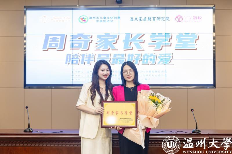 活动现场举行了授牌仪式。温州大学家庭教育研究院院长周奇教授向温州童创会瑞安分会会长、蓓蕾幼童&丫丫舞校创始人杨晓琴授予“周奇家长学堂”基地。