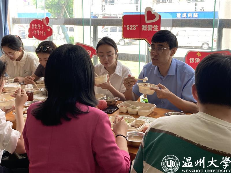 所谓“爱生”,可以是共进一顿午餐。“大家先吃饭,边吃边聊。”在温州大学怡口乐餐厅,周奇与折延东老师同自己的学生们一起,在轻松氛围中,既愉快享用美食,又谈论“爱生”的真谛。“今天和周老师一边吃饭一边唠家常很有意思,以后我如果成为一名老师,也要像今天这样和我的学生零距离接触!”一位同学如是说。