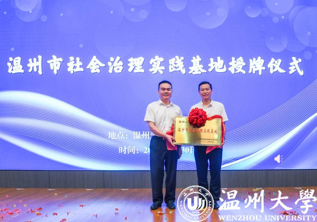 黄建斌为温州大学授温州市社会治理实践基地牌,成人网站 党委书记、社会心理服务中心主任何毅教授接牌。