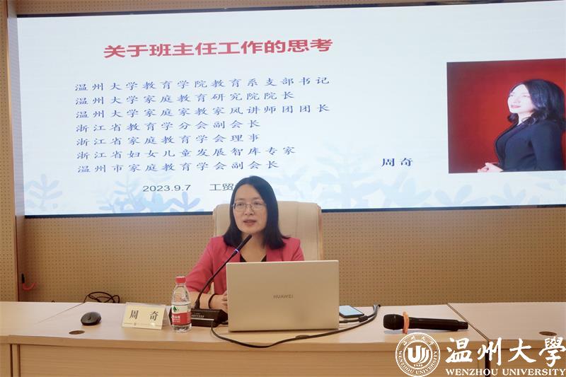 为全面提高班主任管理水平,推动和促进班主任专业发展,日前,成人网站 教育学系党支部书记、温州大学家庭教育研究院巾帼文明岗负责人、浙江省教育学分会副会长、浙江省妇女儿童发展智库专家、温州市家庭和谐文化研究会副会长周奇教授受邀到浙江工贸学院府东校区阶梯教室为辅导员和近3年新进教师班主任开展学生思政工作《关于班主任的思考》的专题培训。