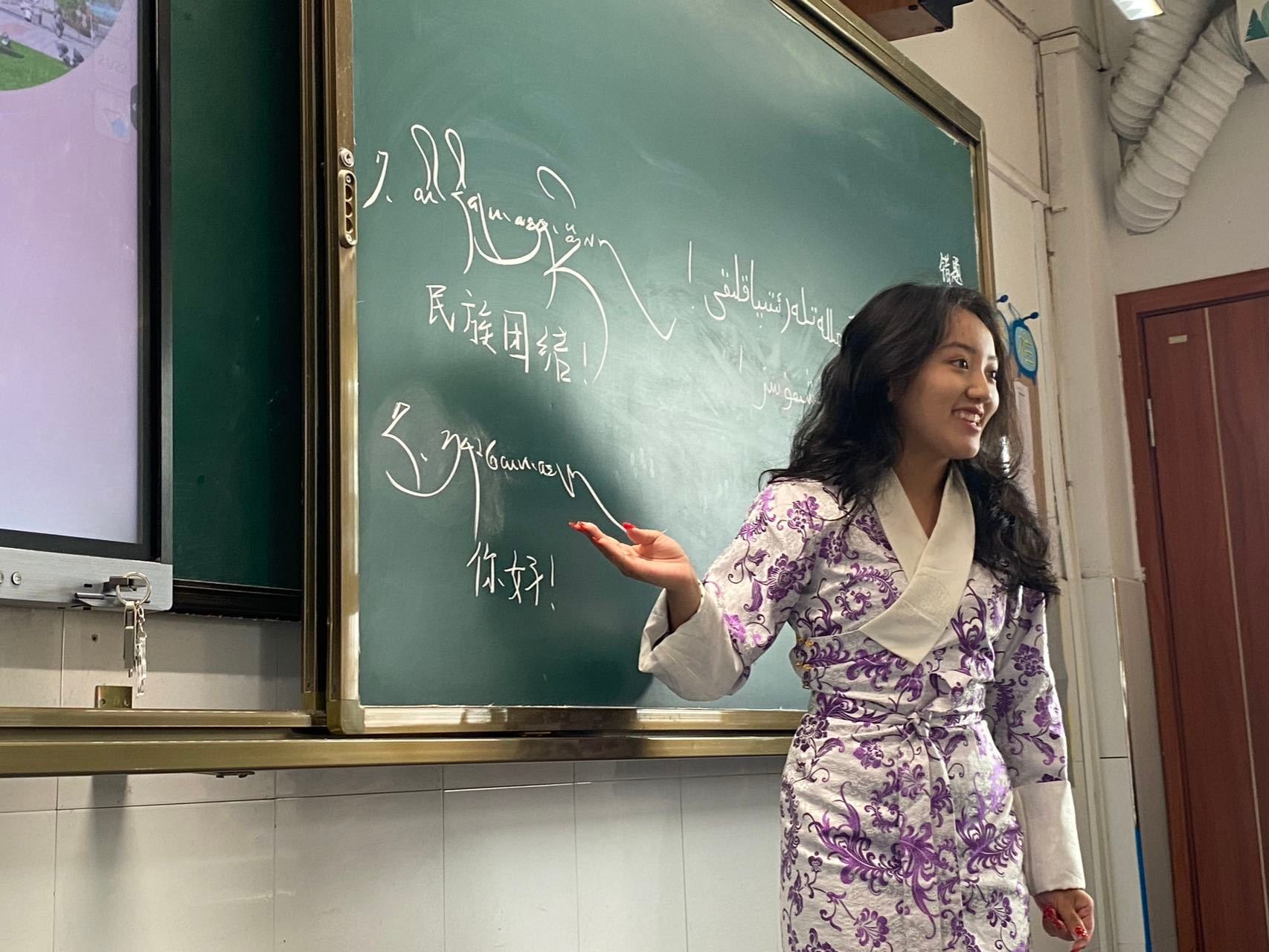 “民族团结我来学”环节中,在青年宣讲员的带领下,孩子们争先恐后地用藏语、维吾尔语说出人生第一句民族语问候。伴着《麦西来普》的鼓点,迈着新疆舞步,民族青年牵着孩子们旋出同心圆,四十平方米的教室瞬间化作艺术的万花筒,清脆的笑声如浪花般在教室里层层荡漾。