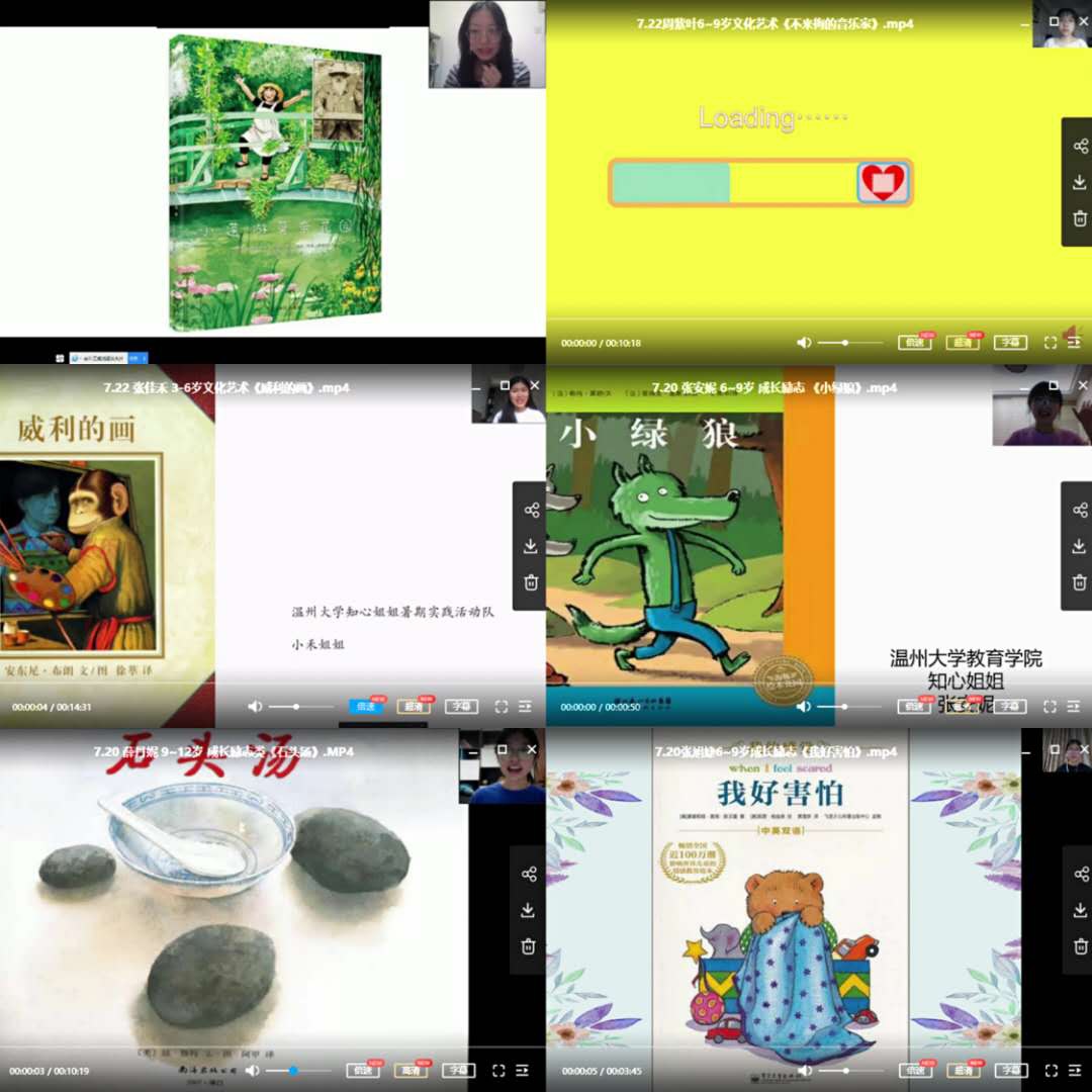 温州大学知心姐姐实践队队长徐夏介绍:“除了在线上开展绘本课程,实践队员还积极地参与到手工制作绘本当中,从编写绘本故事到画图填色,一笔一画都注入了对孩子们的关爱。无论是绘本录制还是手工制作,每个队员都专心致志,精益求精,努力为小朋友呈现出最好的故事”。