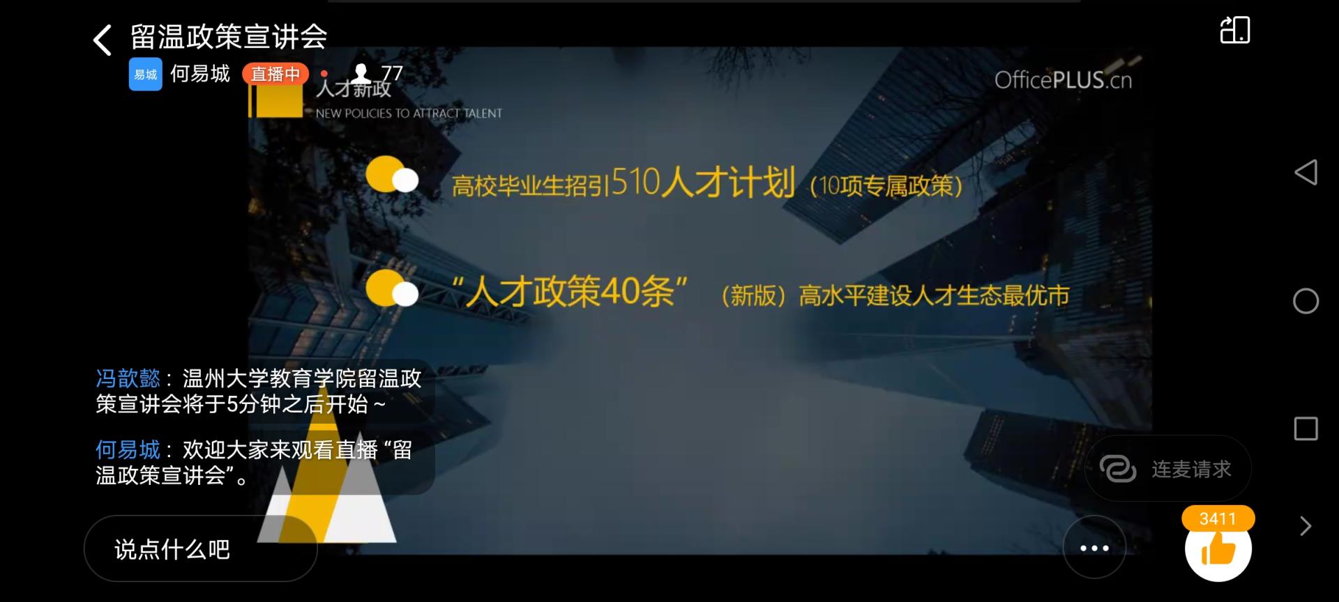 参加宣讲会的同学纷纷表示,人才是城市的灵魂,城市与人才共同成长、相互成就。温州近来不断推出人才留温红利政策,择天下英才而用之,不仅是针对城市发展而提出的政策,更是成全城市与人才相得益彰的谋略。通过本次宣讲会和温州人才日的设立,了解到了许多政府和高校的新政策,对未来的规划不再迷茫,也有了坚定的方向。