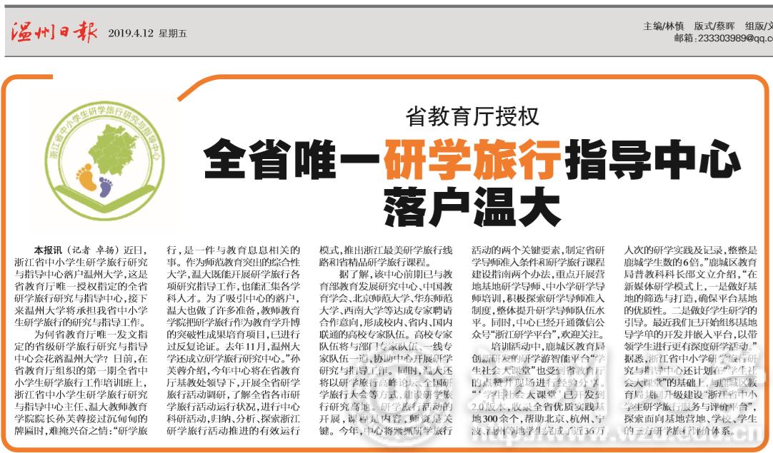 近日,浙江省中小学生研学旅行研究与指导中心落户温州大学,这是省教育厅唯一授权指定的全省研学旅行研究与指导中心,接下来温州大学将承担我省中小学生研学旅行的研究与指导工作。