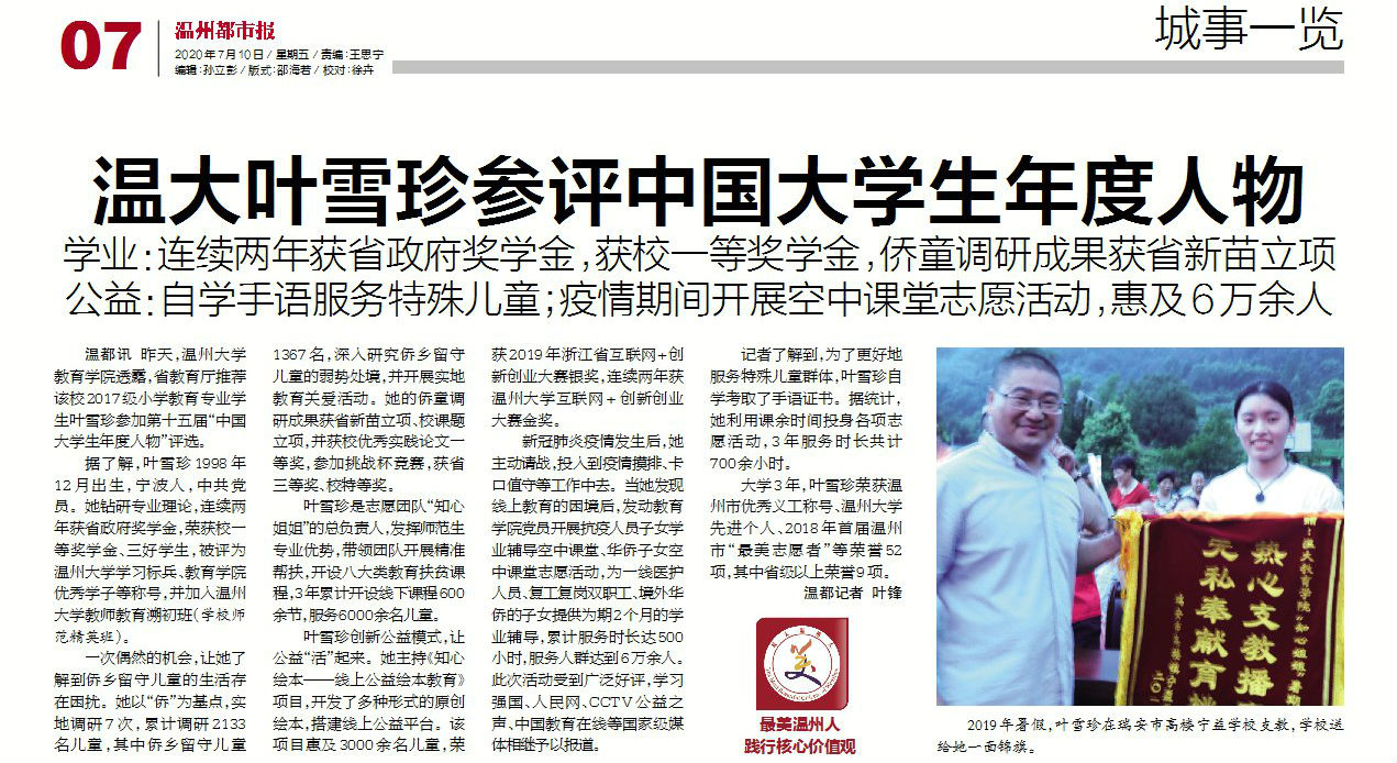 叶雪珍创新公益模式,让公益“活”起来,让她的“教育梦”辐射到更多孩子。她主持《知心绘本——线上公益绘本教育》项目,开发了多种形式的原创绘本,搭建线上公益平台。该项目惠及3000余名儿童,荣获2019年浙江省互联网+创新创业大赛银奖、连续两年获温州大学互联网+创新创业大赛金奖。