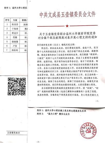 在成人网站 党委的大力支持下,温州大学心理系教工党支部志愿服务队即刻对口支援文成县玉壶镇的疫情防控工作。心理系教工党支部书记陈美芬副教授等7位专家组成的专业团队,通过主动介入、心理支持热线和网络辅导等方式,面向玉壶镇全体干部及被隔离对象开展服务工作。