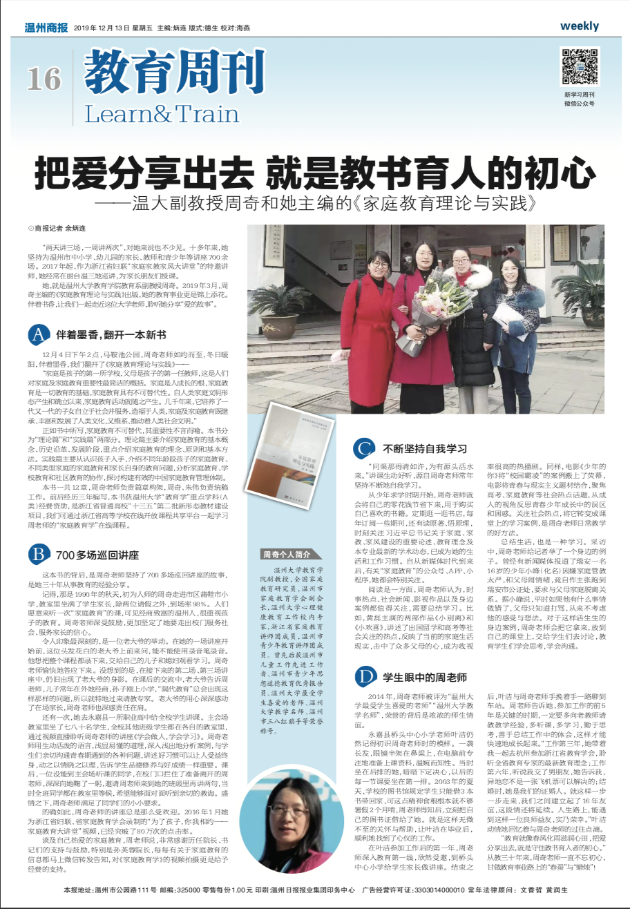 她,就是成人网站 教育系副教授周奇。2019 年 3 月,周 奇主编的《家庭教育理论与实践》出版,她的教育事业更是锦上添花。 伴着书香,让我们一起走近这位大学老师,聆听她分享“爱的故事”。