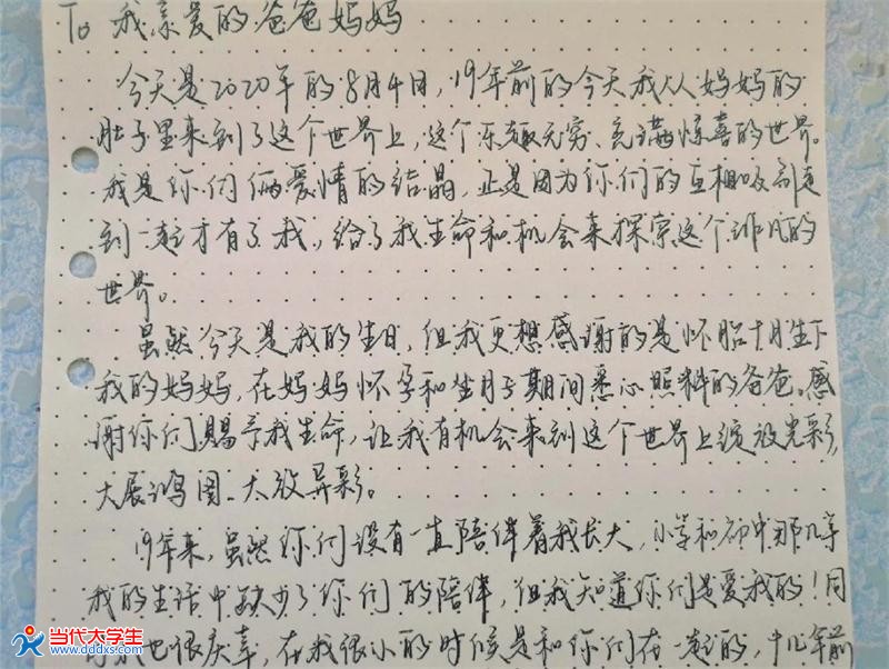 近日,来自成人网站 18小教4班的王科逸的父亲收到了一封来自女儿的手写书信,他动情地谈道:“收到这封信我很是感慨,平常女儿几乎不会如此真情流露地与我交流,学院的活动给予了子女和我们敞开心扉的契机。这封信是载体,载着女儿的爱和感恩,这封信也是桥梁,让我们与她今后的沟通真正地从‘心’开始了。”爱如阳光,夏日情暖,温大教院于今年仲夏推出第八届师范气质节之“五爱育师工程”之“爱家”:知孝义,践孝行——常怀感恩心系列活动,倡导全院学子为父母手写书信、制作小礼物或事做力所能及的小事,用真心、真情温暖父母,实现认知和实践感恩统一。