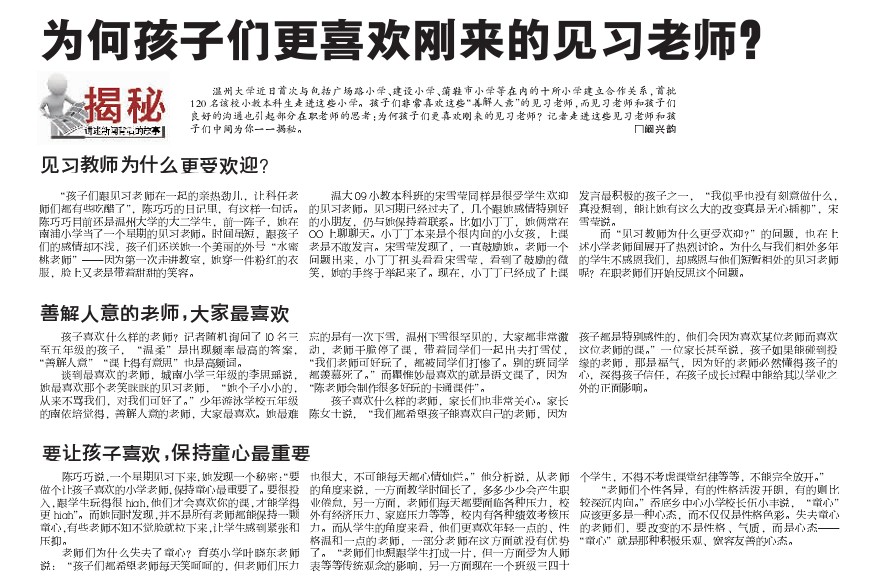 温州大学近日首次与包括广场路小学、建设小学、蒲鞋市小学等在内的十所小学建立合作关系,首批120名该校小教本科生走进这些小学。孩子们非常喜欢这些“善解人意”的见习老师,而见习老师和孩子们良好的沟通也引起部分在职老师的思考:为何孩子们更喜欢刚来的见习老师?记者走进这些见习老师和孩子们中间为你一一揭秘。□阚兴韵