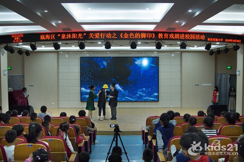温州市瓯海区仙岩实验小学的大礼堂里爆发出阵阵掌声和欢呼声。为响应“同迎亚运 文明十讲”,发挥社会组织力量,助力美丽瓯海建设,10月30日下午,由温州市瓯海区精神文明建设指导中心主办的“童沐阳光”关爱行动特邀温州大学沐童翎教育戏剧社,为该校的新居民子女送去别开生面的礼物——《金色的脚印》课本剧表演。