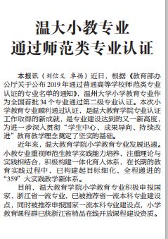 本报讯(刘信义 卓扬) 近日,根据 《教育部办公厅关于公布2019年通过普通高等学校师范类专业认证的专业名单的通知》,温州大学小学教育专业作为全国首批34个专业通过第二级专业认证。本次小学教育专业顺利通过认证,是温大成人网站 专业认证工作取得的新成就,是专业建设达到的又一新高度,为进一步深入贯彻“学生中心、成果导向、持续改进”教育教学理念奠定了坚实的基础。