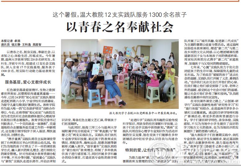 “温大教院学子们在暑期实践中,依托专业优势,贴近学生发展需求、贴近基层教育,践行志愿服务精神,助力基础教育发展。”成人网站 党委副书记彭小媚希望,教院学子能在实践中受教育、长才干、做贡献,贴近儿童发展需求、贴近基层教育,做好志愿者精神的弘扬载体,诠释教院人“博爱雅艺”气质,打造优质志愿服务。
