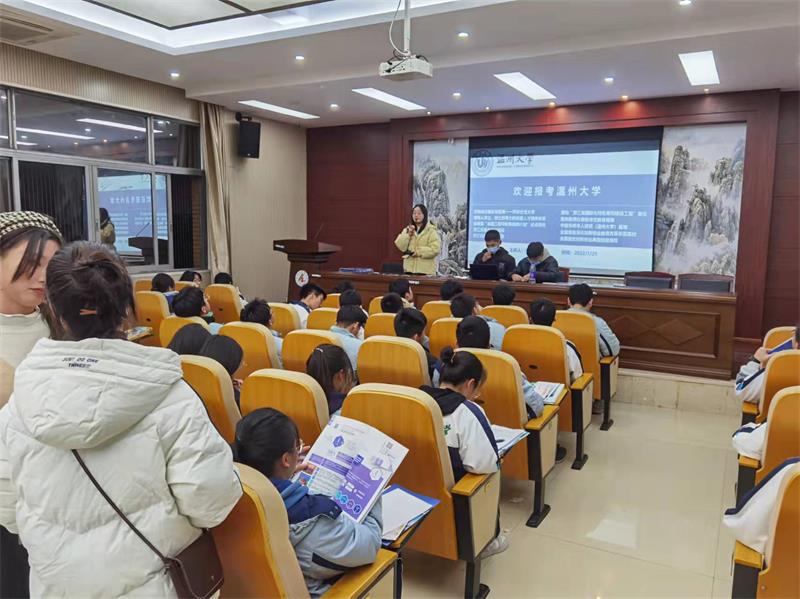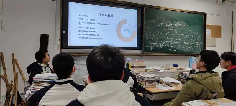 冰雪还未消融,寒风仍然瑟瑟。“啊对对对”队用他们炽热的心驱散了冬日的寒冷。他们提前做好分工,联系对接母校及相关部门,确定好时间和活动形式,并整合好各类宣讲物品,为这次宣讲做足了准备。回访当日,队员们与母校高三老师联系沟通好,由高三年级组长统一将宣传视频、宣传手册下发给各班班主任,并选择特定的时间观看,帮助各班同学们全面深入了解温州大学。此外,他们还和学弟学妹们展开线下交流,介绍温州大学办学特色、潜在优势,帮助解决关于三位一体、高考填报分数线等问题,展示了温州大学的良好形象,燃起学弟学妹们对报考温大的浓厚兴趣。在这所浙江省一级普通高中特色示范学校里,队员们在活动中不仅重温了师生情谊,也找到了满满的幸福感和获得感。