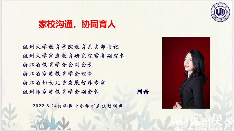 2022年8月24日上午8:30,全国家庭工作先进个人、浙江省妇女儿童发展智库专家、温州大学家庭教育研究院巾帼文明岗岗长周奇老师受邀线上为绍兴柯桥区中小学优秀班主任培训班做《家校沟通,协同育人》专题讲座。