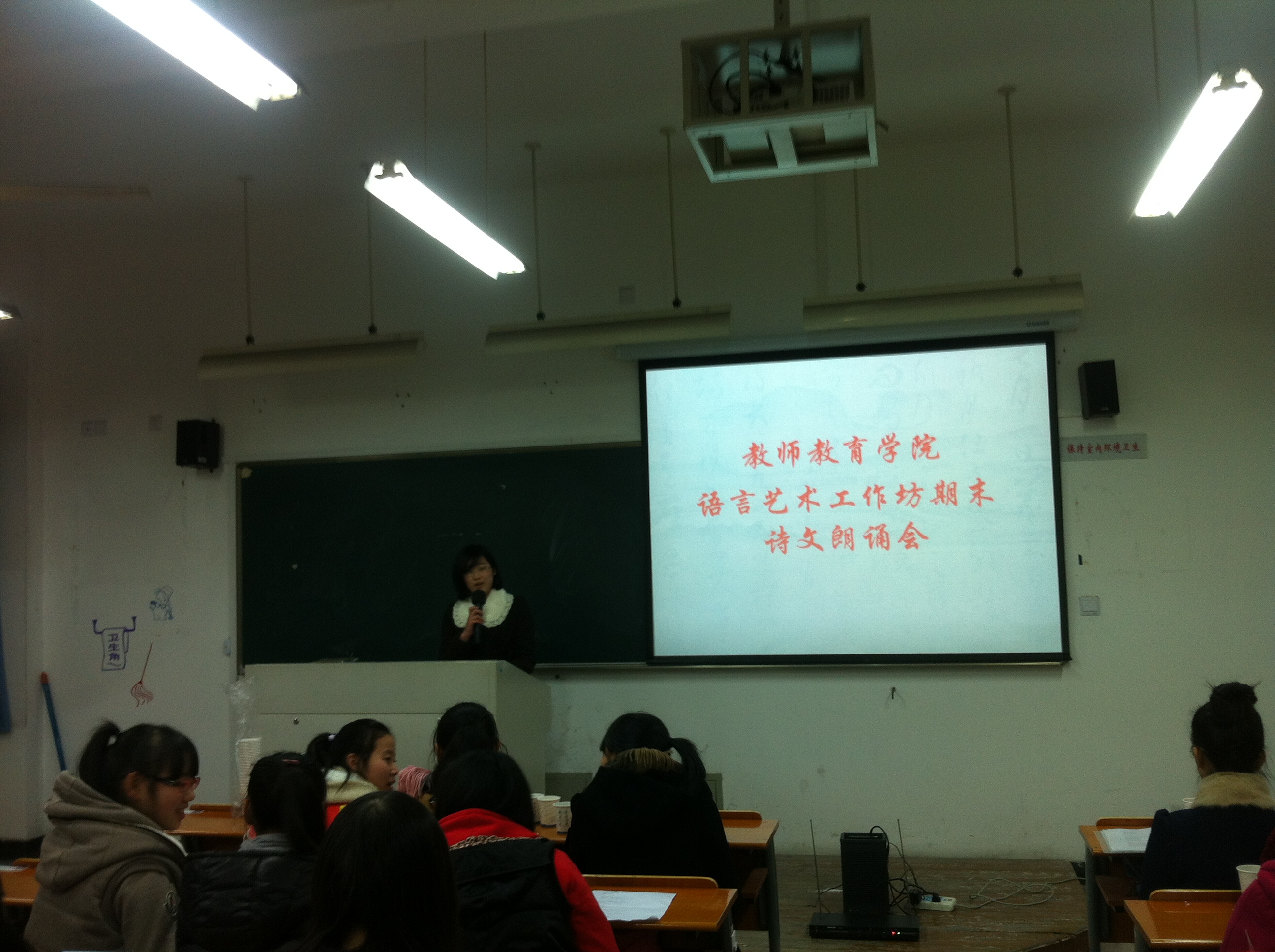 在主持人深情并茂的开场白后,本次朗诵大会正式开始。“牵牛花,三月梅,一点一滴的平静,一朵两朵的温暖”,邵慧慧同学的《家园如梦》将所有人带入了像梦一般如诗如画的家园。而接下来由张吉勤、虞静婕等同学朗诵的《烟尘中的张爱玲》,花开无声岁月无痕,那个烟尘的悲情高手,将世俗的嘲讽化为心底的一滴泪,兜兜转转的时间里,她的美穿透了时光的无涯就那么真实的在我们眼前轰轰烈烈地展现。然后《那时,你老了》,《你是我心底的一首歌》,《繁星》……每一篇都融入朗诵者心灵里对文章不同的见解,通过朗诵,飞扬起来。宋一帆老师点评了大家的朗诵,并亲自指导和示范正确的发音、连读等朗诵技巧,同学们在老师的带领下,对朗诵的诗歌又有了一番新的体会,获益匪浅。