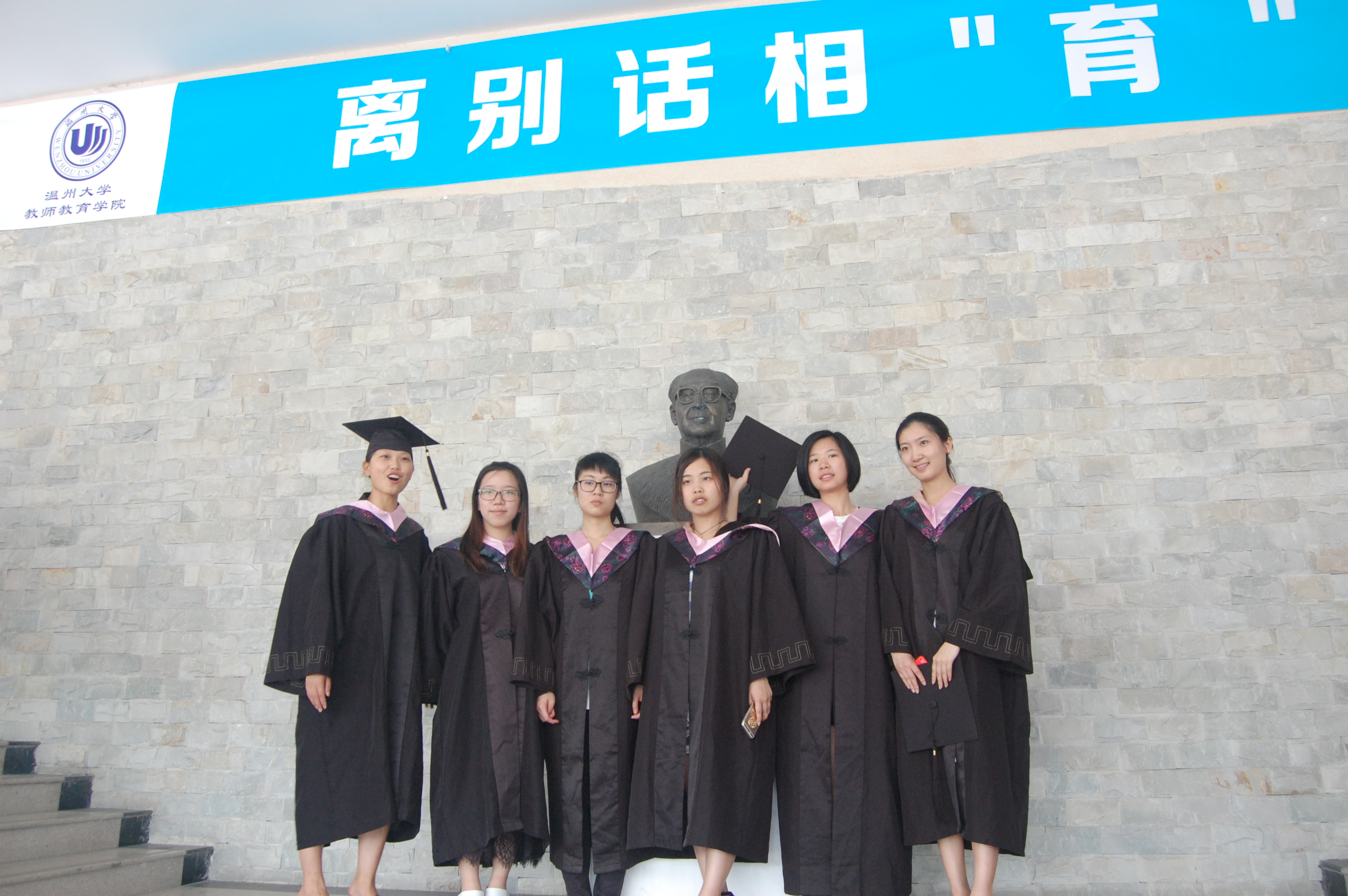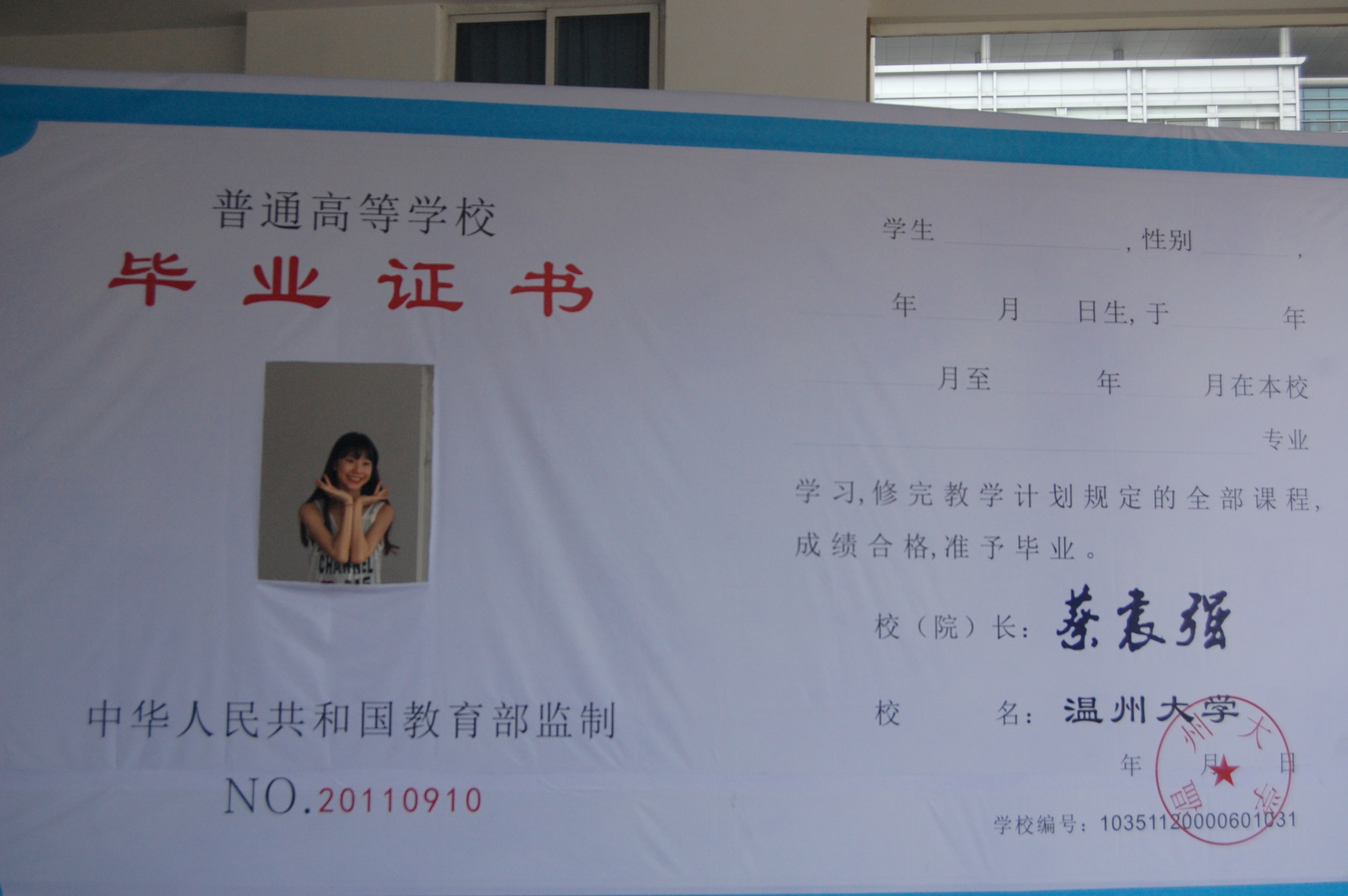 学院还别出心裁地在音乐厅门口台阶右侧放置了巨幅的温州大学毕业证书喷绘,同学们以一张张“真人版”的毕业证书定格毕业的美好瞬间;台阶左侧,一张由教师成人网站