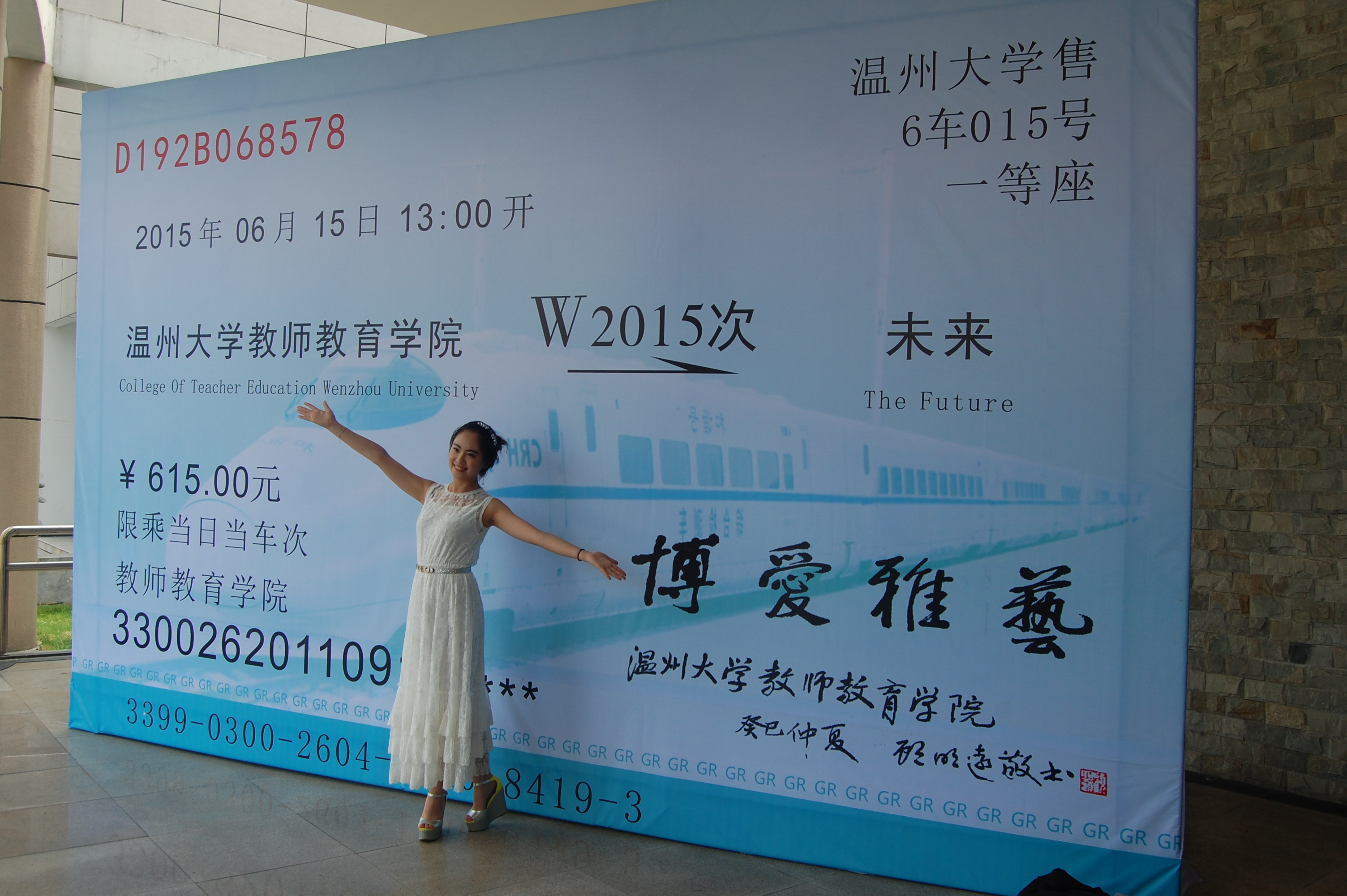 ”,终点站为“未来”,车票上的数字也隐藏了深刻的寓意:车次是W2015,即“温大2015”,车型为“博爱雅艺”号,车票编号是毕业生们四年前入学的日子,价格是毕业典礼的日子。殷切希望全院毕业生能够将学院赋予的最珍贵的毕业礼物——“博爱雅艺”的师范气质装入行囊,驶向幸福的未来!