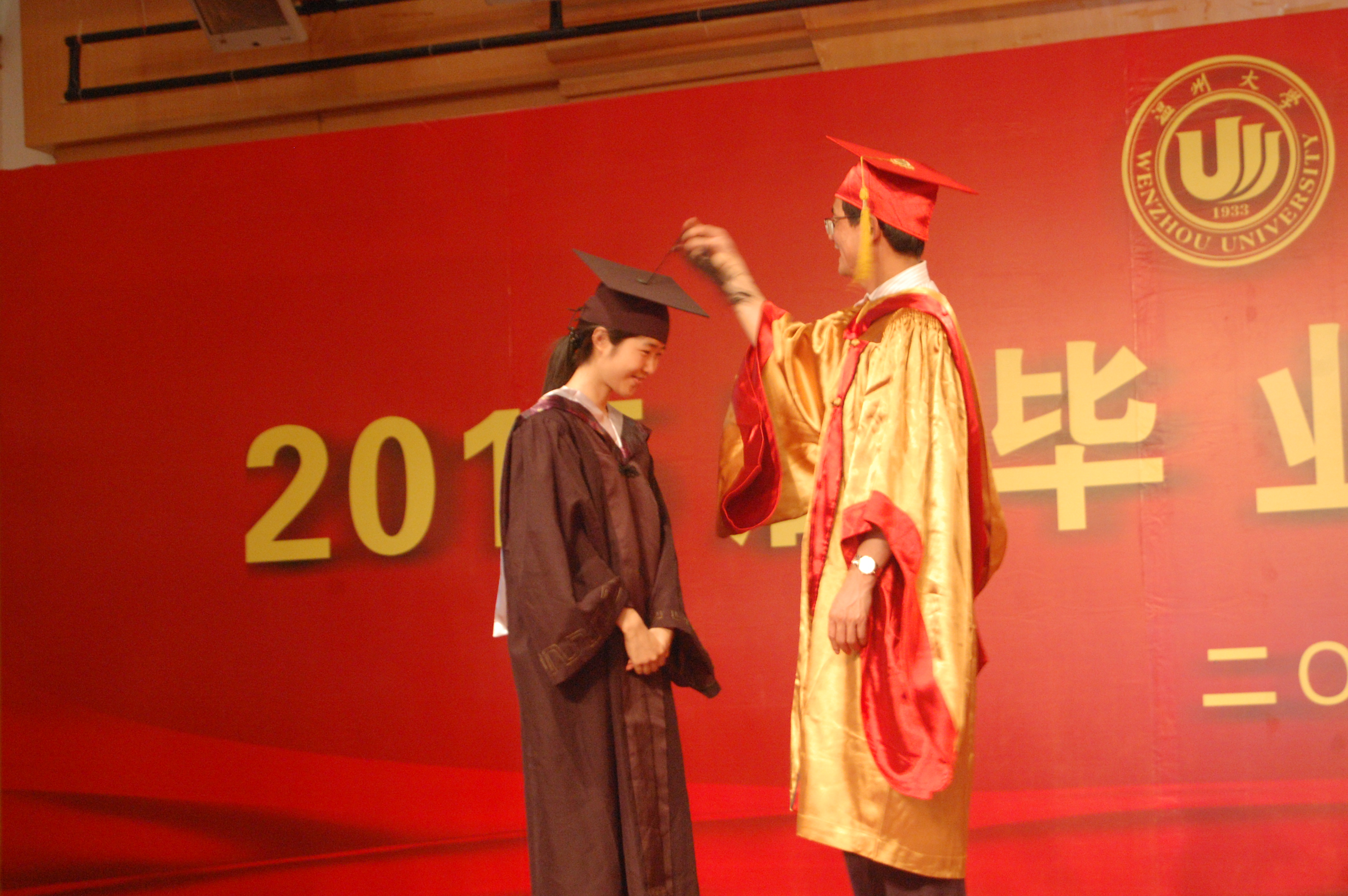 典礼上,蔡袁强校长与每位毕业生深情握手,亲手为395位毕业生正冠拨苏、颁发毕业证书并合影留念,整个会场气氛热烈,整整持续了2个多小时,许多毕业生激动深情地拥抱校长以示喜悦,大家深深感动,一起向着校长深情喊道:“蔡校长,您辛苦了!我们永远爱您,爱母校!”喊出了所有毕业生的爱校心声。