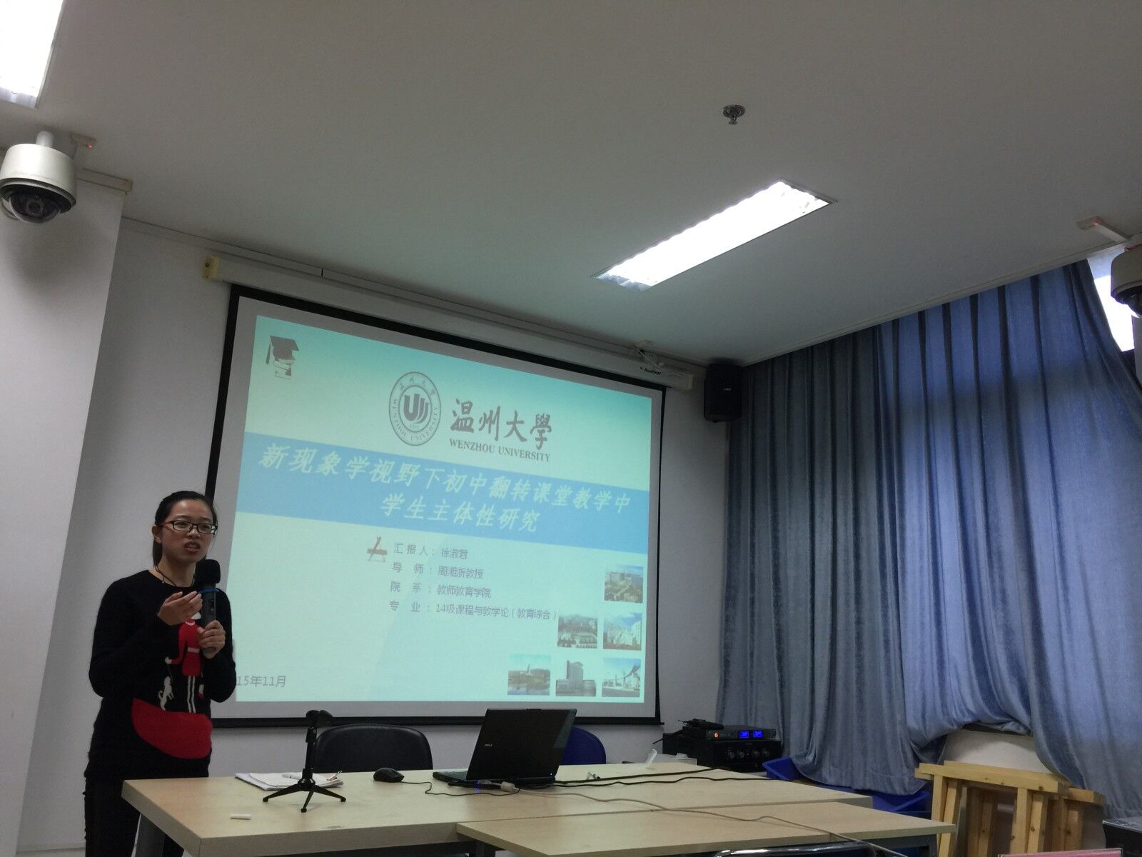 此次校际交流论坛由成人网站 研会主席王庆超与杭师大成人网站 研会主席姜霞主持。会议伊始,杭师大仲玉英院长致欢迎辞,折延东老师对温杭校际交流会的历史渊源做简单介绍并预祝此次交流圆满成功。会中,双方研究生依次交流了各自关注的学术问题,新颖独特的研究视角、丰富多样的研究内容以及汇报同学激情澎湃的论述、台下同学踊跃的提问质疑,无不吸引着与会者的眼球,会场学术氛围甚浓。师生们从研究内容、研究方法、研究视角、应用前景等方面聚集互联网时代下教育的改革与创新。会议在徐淑君同学的“新现象学视野下初中翻转课堂教学中学生主体性研究”中步入高潮,张华老师从跨学科意识、鲜明的问题意识、创造的意识三方面对此研究给与较高的评价与肯定,同学们也纷纷赞同。这让我们对互联网时代下教育的改革创新与跨学科的研究意识有了新的感悟与收获。