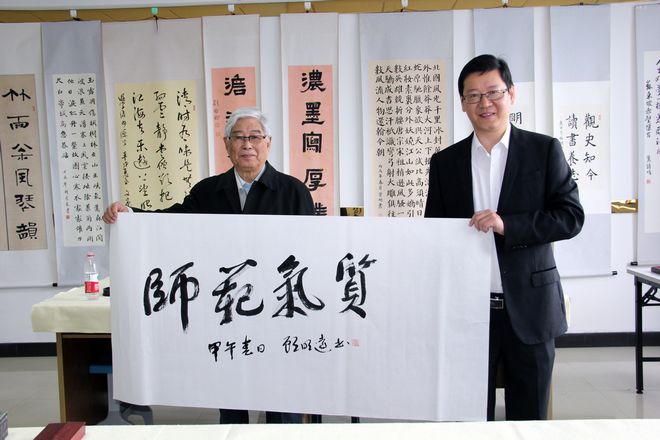 顾先生一行先后参观了蒙特梭利教学实验室、奥尔夫音乐教学法实验室、感觉统合实验室、未来教室、书法实验室,对实验中心先进的设备和教育理念表示赞许。在书法实验室,面对认真书写的学生,顾先生欣然写下“师范气质”的题词,笔力依然深厚遒劲,并对成人网站