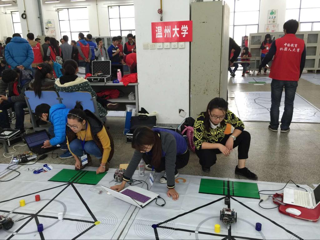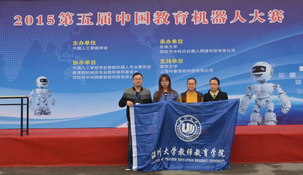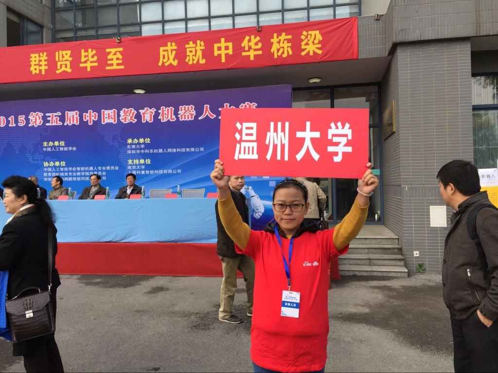 2015年11月14-15日,由中国人工智能学会主办的第五届中国教育机器人大赛在南京东南大学举行,参赛的有来自全国大中院校的200多支队伍。在比赛的两天时间里,分别进行了机器人智能搬运(C51)、机器人创意设计、机器人擂台、机器人搬运码垛、机器人灭火、机器人游中国等比赛。由张新老师指导的,成人网站 小学教育系12科学班的吴瑞荧以及13数学班的张真真、曾竞莹组成的温州大学教育队不畏强手,奋勇拼搏,取得“2015中国教育机器人大赛”智能搬运比赛(C51组)一等奖的佳绩,为学校争了光!