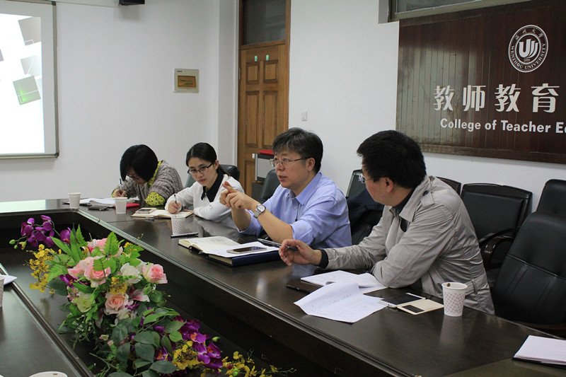 李校堃校长一行首先听取了郑信军院长所作的学院发展情况与未来发展思路的报告。郑院长在汇报中从学院的办学历史、师资队伍建设、科研与专业建设、人才培养、服务基础教育等方面的情况,特别介绍了学院坚持与推进“师范气质”人才培养方略的情况。他总结了学院十二五期间的主要工作及成果,并提到了学院制定十三五规划的基本思路。其他学院领导做补充介绍。杨立淮书记着重就学院师德师风建设和校园文化品牌建设工作做了介绍,潘玉进副院长就学院发展过程中需要学校支持的事项进行了说明,彭小明副院长介绍了由成人网站